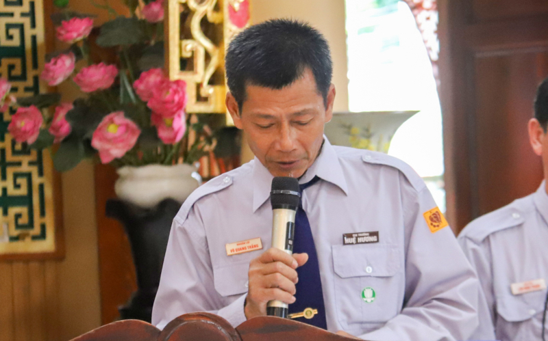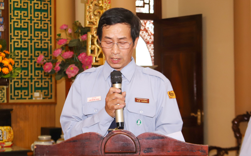 Thay mặt Ban Hộ trì Tam bảo chùa Huệ Hương, Bác Lê Hữu Khải trang nghiêm tuyên đọc Quyết định công nhận Ban Huynh trưởng mới.