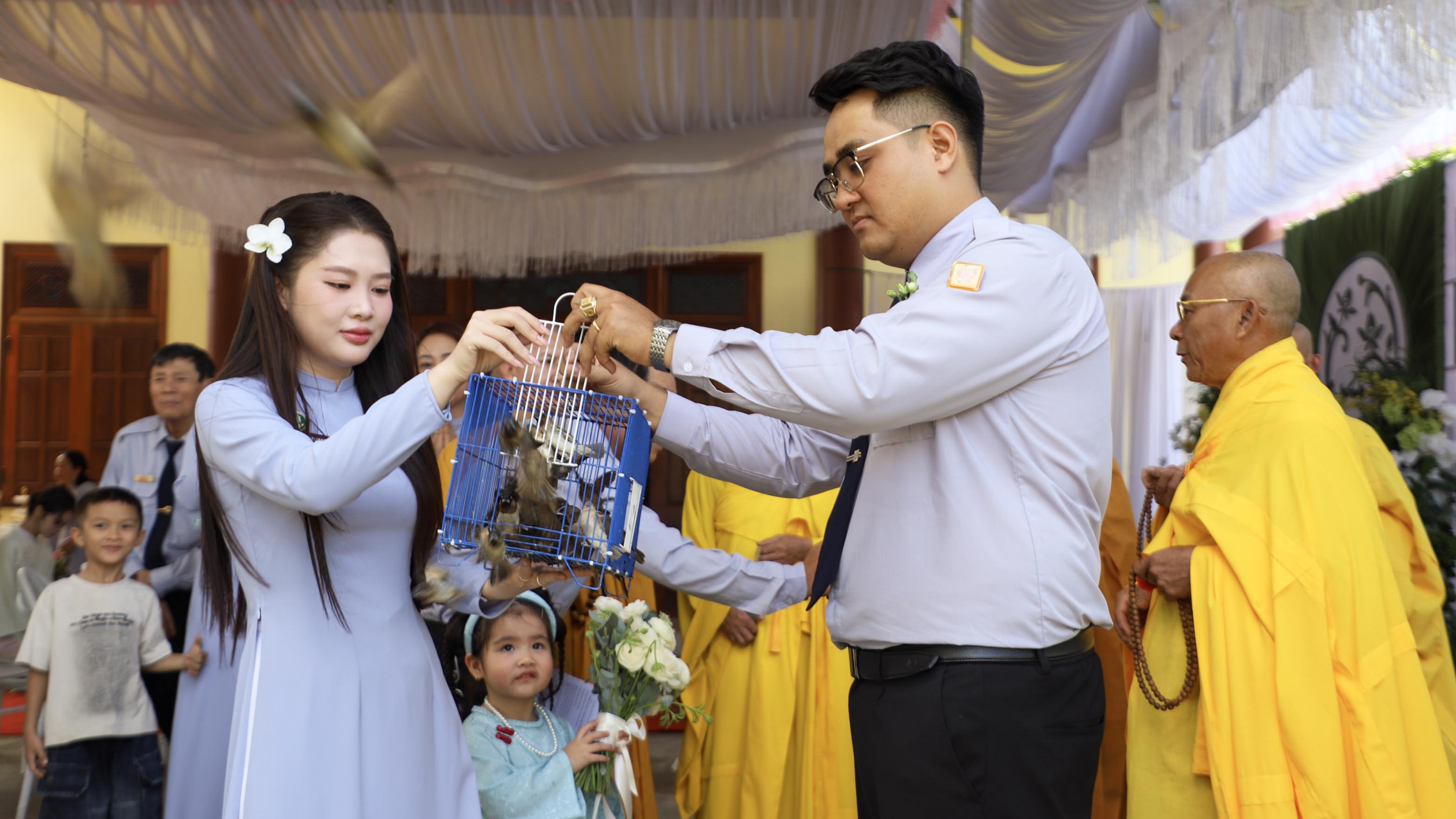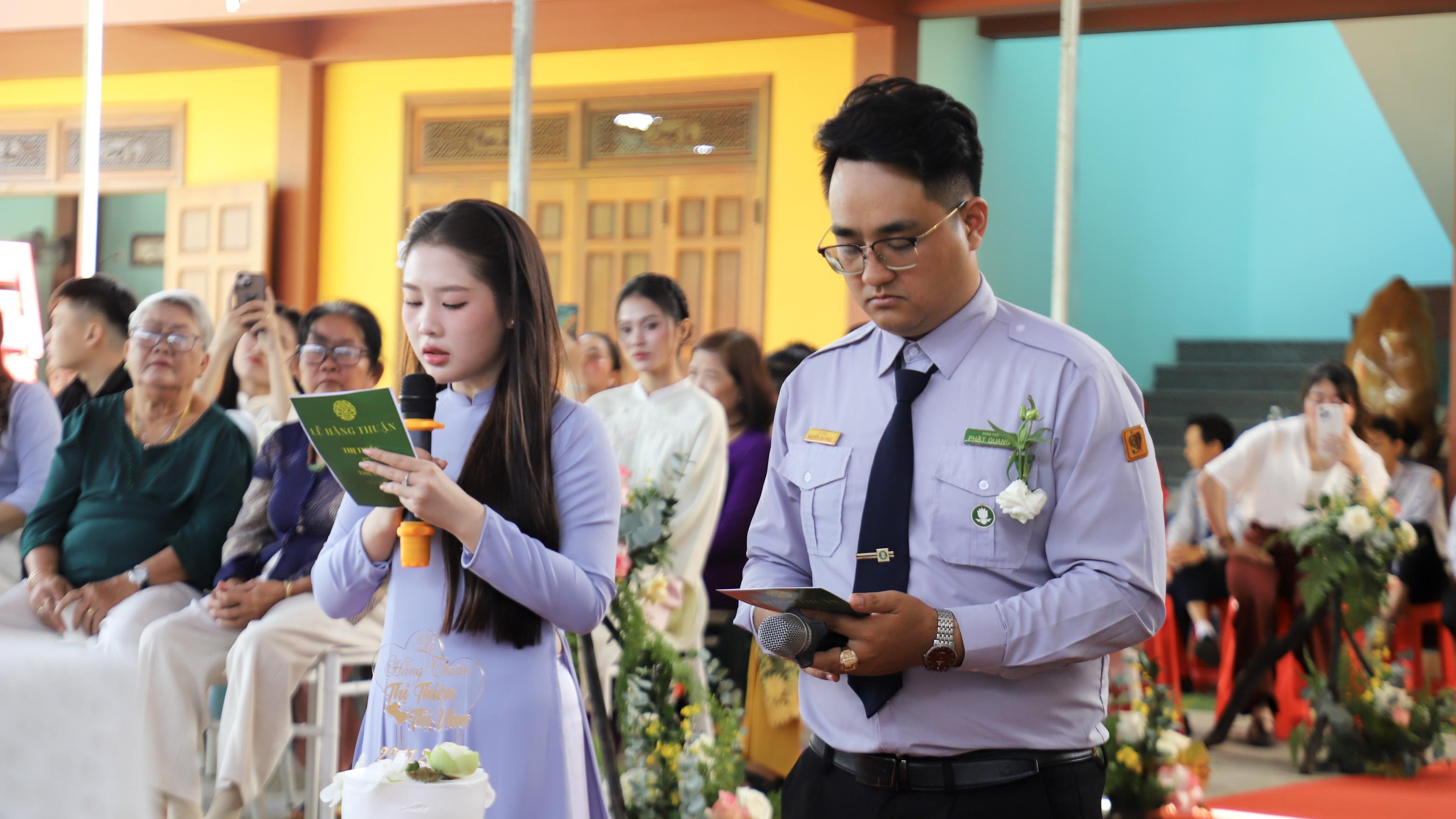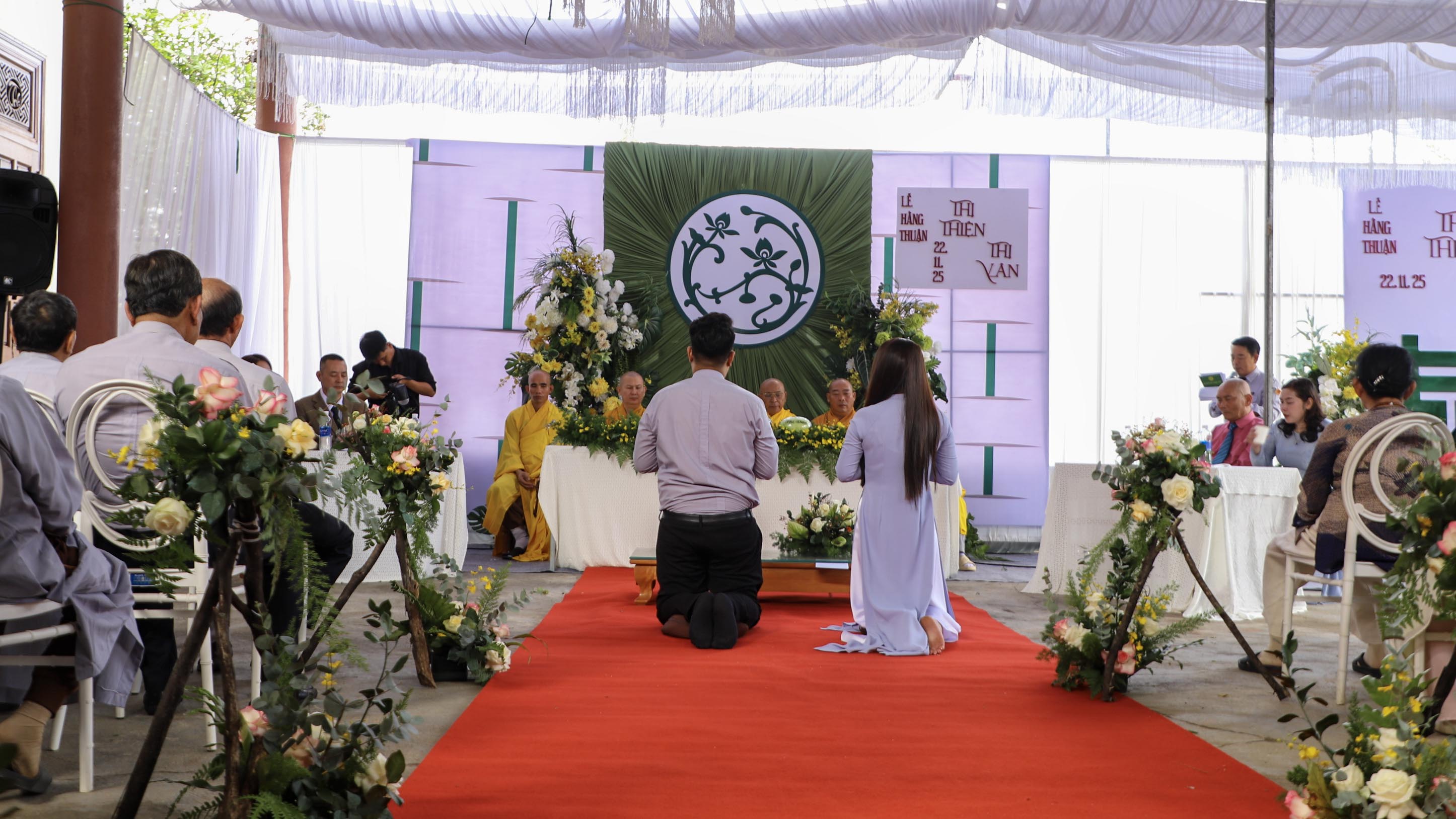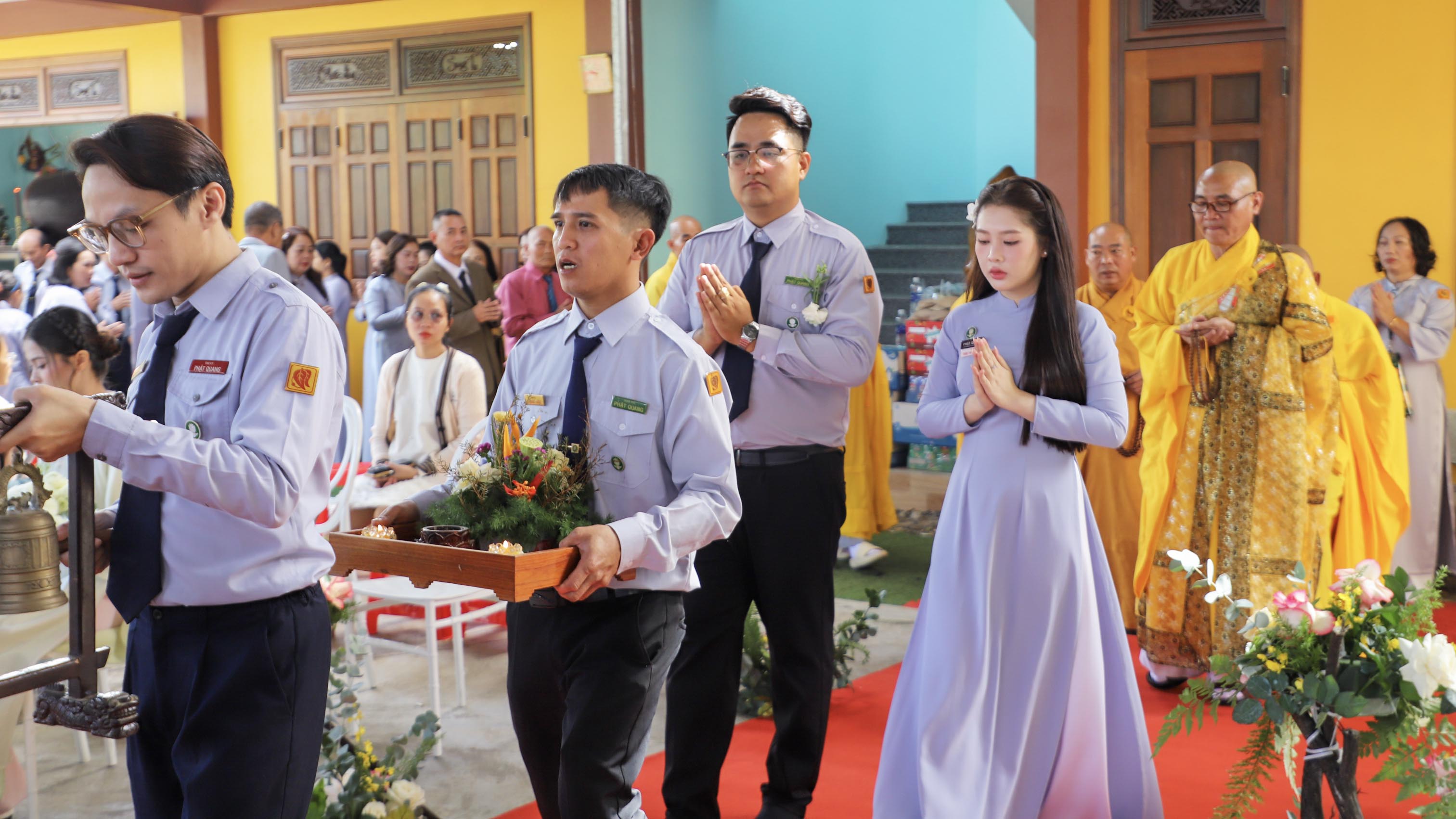 Nghi lễ được cử hành tuần tự và trang nghiêm. Đôi tân lang – tân nương đã thực hiện nghi thức trao nhẫn cưới, biểu trưng cho sự gắn kết trọn đời và lòng chung thủy. Trước Tam Bảo và chư Tôn đức, hai huynh trưởng đã dâng lời phát nguyện, nguyện cùng nhau xây dựng mái ấm hiểu thương, cùng tu học và làm tròn bổn phận người Phật tử trong gia đình mới.